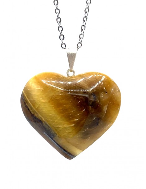 El collar destaca por su talla en forma de corazón, es una joya elegante, original y divertida. Diseñada con piedras naturales de Ojo de Tigre. Está ensamblado a mano en Acero, tanto el colgante como su cadenita.