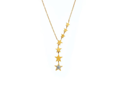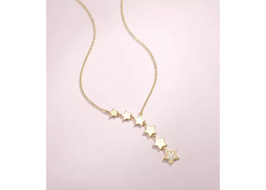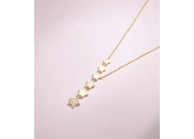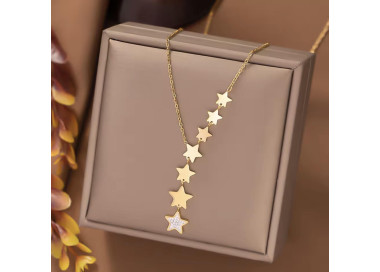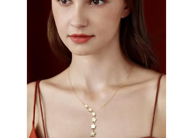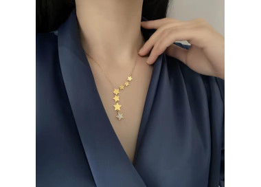 Cada estrella se enlaza suavemente con la siguiente, formando una silueta en “Y” que estiliza el cuello y realza cualquier escote con un toque romántico y sofisticado. La estrella inferior, adornada con destellos brillantes, añade un toque final de elegancia que capta miradas sin esfuerzo.