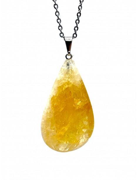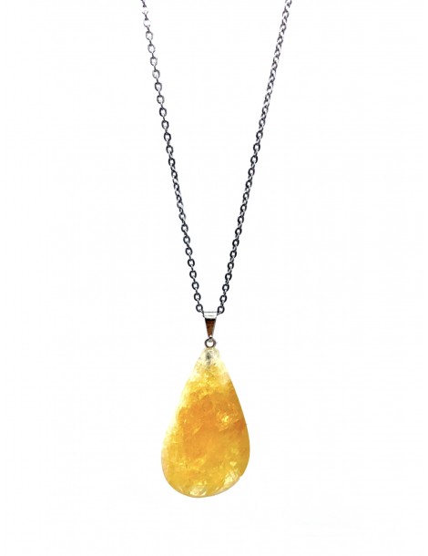 El collar destaca por su forma de gota, es una joya elegante, original y divertida. Diseñada con piedras naturales de Cuarzo Citrino. Está ensamblado a mano en Acero, tanto el colgante como su cadenita.