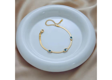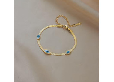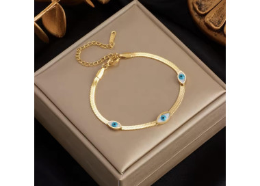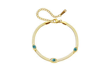 Descubre el encanto luminoso de la pulsera Ojo Turco, una pieza diseñada para quienes buscan la belleza, significado y un destello de sofisticación en cada detalle. La cadena de Acero dorado realzan los tres charms con cristales multicolor engastados que capturan la luz con un brillo exquisito.