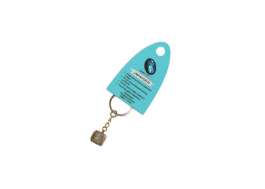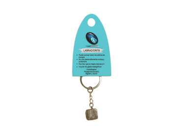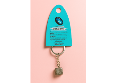 Elegante llavero elaborado en piedra natural de Labradorita que destaca por su color gris verdoso con reflejos azulados.