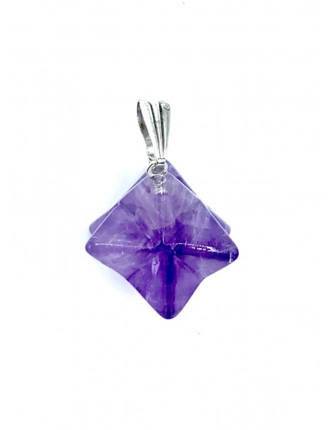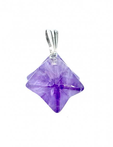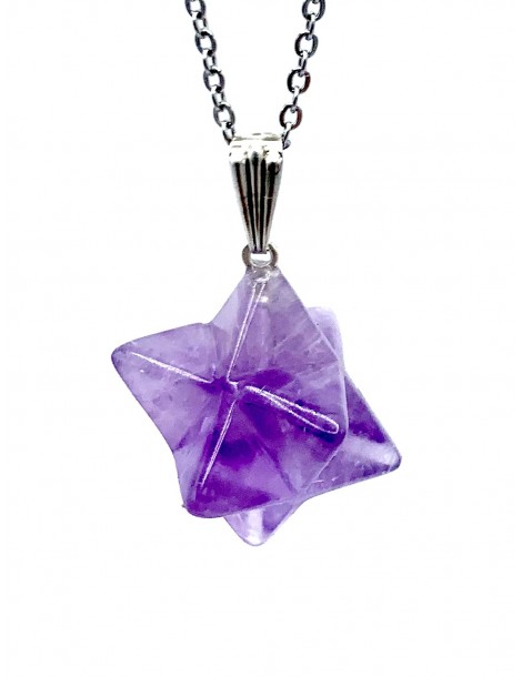 El colgante destaca por su forma de mercaba, esta hecho a mano por maestros artesanos que tienen mucha experiencia en la talla de joyas en minerales naturales. Los mercabas son la manifestación de una perspectiva superior. Espiritualmente, los mercabas representan el camino hacia la iluminación Es elegante, original y divertido. Diseñado con piedras naturales de Amatista. Está ensamblado en Acero.