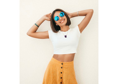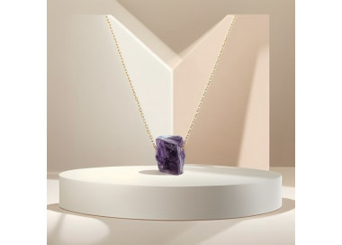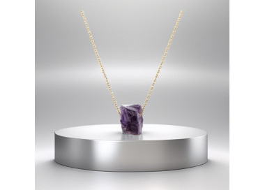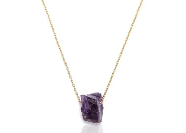 El collar destaca por su original forma al natural sin pulir, es un collar elegante, fino y divertido. Diseñado con piedras naturales de Amatista, le dará un toque especial a tu look. Está ensamblado a mano en Acero, tanto el colgante como su cadenita.