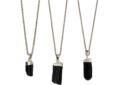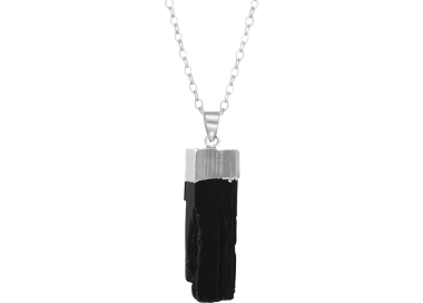El collar destaca por su original forma al natural sin pulir, es un collar elegante, fino y divertido. Diseñado con piedras naturales de Turmalina Negra, le dará un toque especial a tu look. Está ensamblado a mano en Acero, tanto el colgante como su cadenita.