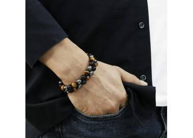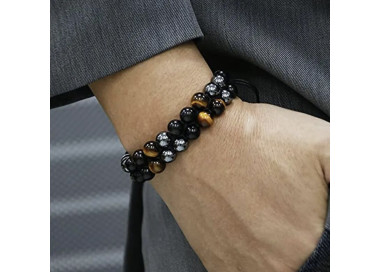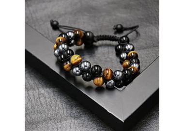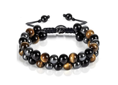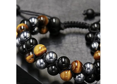 Es una pulsera de bolas de Ojo de Tigre - Turmalina Negra - Hematites, destaca por sus colores marrones con reflejos amarillos. El cierre de macramé ajustable le añade un diseño único, es una pulsera exclusiva y elegante. Te la puedes poner en cualquier ocasión.