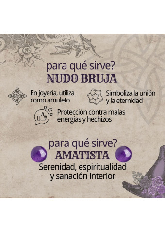 ANILLO NUDO DE BRUJA AMATISTA El anillo nudo de bruja Amatista es un canal de alta vibración. Combina el escudo impenetrable del Nudo de Bruja con...