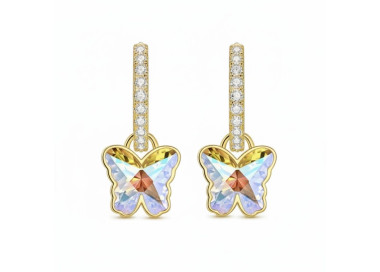 El aro dorado, decorado con brillantes engastados, aporta un toque de lujo sutil que enmarca el rostro y realza la luminosidad natural de la piel. El colgante en forma de mariposa, con sus tonos tornasolados, crea un contraste hipnótico que convierte estos pendientes en una pieza protagonista.