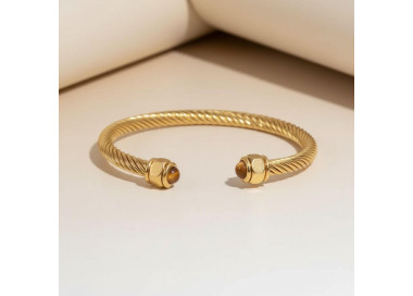 Es una pulsera de hilo trenzado muy llamativa que destaca por sus tonalidades azules con reflejos dorados. Diseñada con piedras naturales de Ojo de Tigre. Es ajustable muy cómoda de llevar.