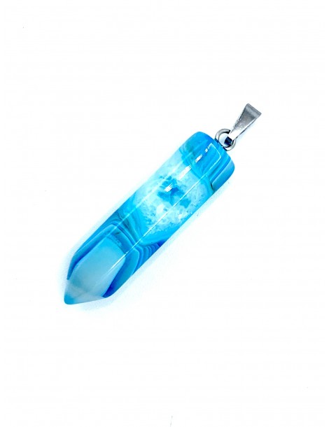 El colgante destaca por su forma de punta, es una joya elegante, original y divertida. Diseñada con piedras de Agata azul. Está ensamblado a mano en Acero.