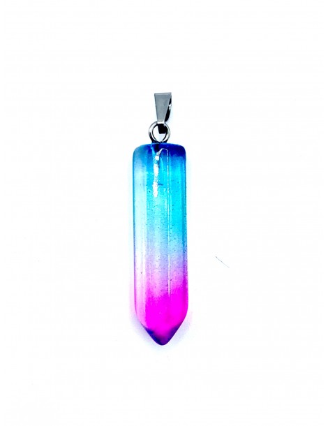 El colgante destaca por su forma de punta, es una joya elegante, original y divertida. Diseñada con piedras de Cuarzo Aura. Está ensamblado a mano en Acero.