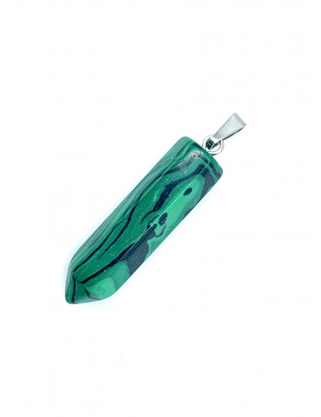 El colgante Kanae destaca por su forma de punta, es una joya elegante, original y divertida. Diseñada con piedras de Malaquita. Está ensamblado a mano en Acero.