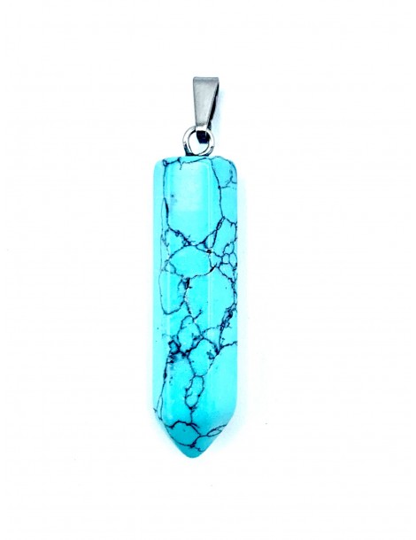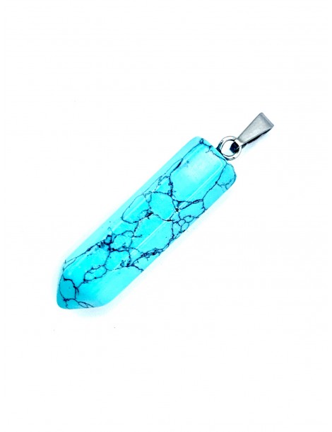 El colgante destaca por su forma de punta, es una joya elegante, original y divertida. Diseñada con piedras de Turquesa. Está ensamblado a mano en Acero.