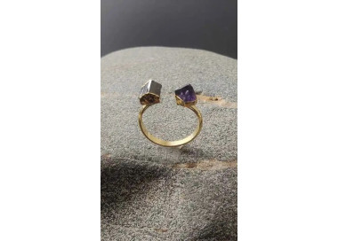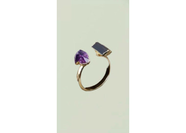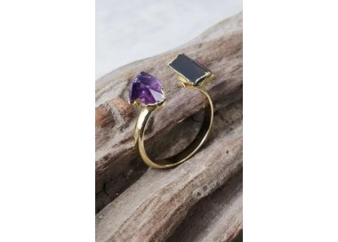 Este anillo destaca por su geometría irregular, es una joya elegante, original y divertida. Diseñado con piedras naturales de Amatista y Turmalina Negra, sin níquel, sin plomo, de material hipoalergénico de máxima calidad para pieles sensibles, esta ensamblado a mano.