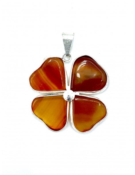El colgante destaca por su forma de Trébol, es una joya elegante, original y divertida. Diseñada con piedras naturales de Cornalina. Está ensamblado a mano en Acero.