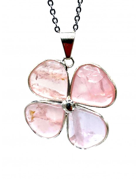 El colgante destaca por su forma de Trébol, es una joya elegante, original y divertida. Diseñada con piedras naturales de Cuarzo Rosa. Está ensamblado a mano en Acero.