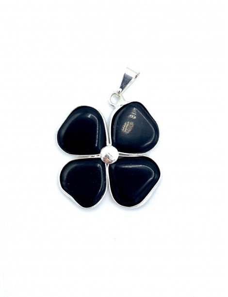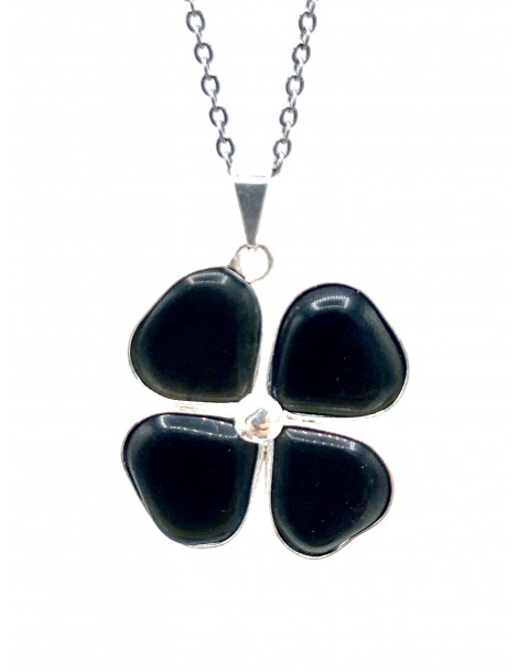 El collar destaca por su forma de Trébol, es una joya elegante, original y divertida. Diseñada con piedras naturales de Turmalina Negra. Está ensamblado a mano en Acero.