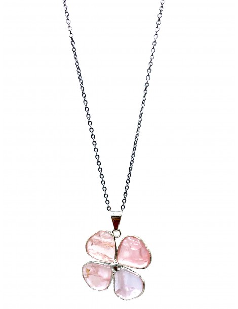 El collar destaca por su forma de Trébol, es una joya elegante, original y divertida. Diseñada con piedras naturales de Cuarzo Rosa. Está ensamblado a mano en Acero, tanto el colgante como su cadenita.