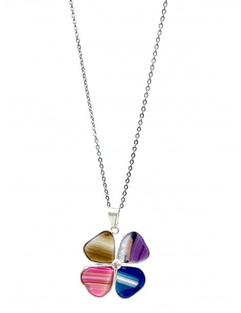 El collar destaca por su forma de Trébol, es una joya elegante, original y divertida. Diseñada con piedras naturales entre ellas "Agatas" de diferentes tonalidades. Está ensamblado a mano en Acero, tanto en colgante como su cadenita.