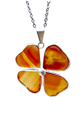 El collar destaca por su forma de Trébol, es una joya elegante, original y divertida. Diseñada con piedras naturales entre ellas "Agatas" de diferentes tonalidades. Está ensamblado a mano en Acero, tanto el colgante como su cadenita.
