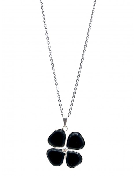 El collar destaca por su forma de Trébol, es una joya elegante, original y divertida. Diseñada con piedras naturales de Turmalina Negra. Está ensamblado a mano en Acero, tanto el colgante como su cadenita.